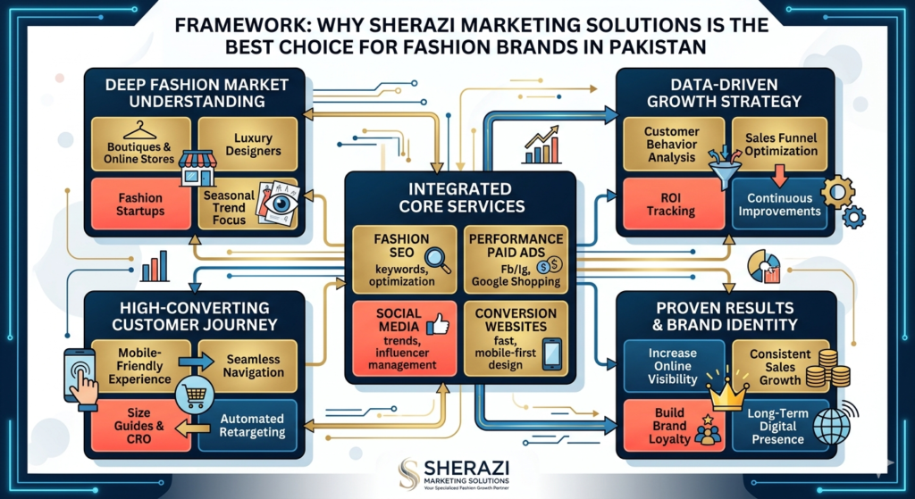 Sherazi Marketing Solutions is one of the leading digital marketing agencies in Pakistan, helping fashion and clothing brands grow their online presence, build strong brand identity, and increase sales through strategic SEO, paid advertising, and conversion-focused digital marketing systems.