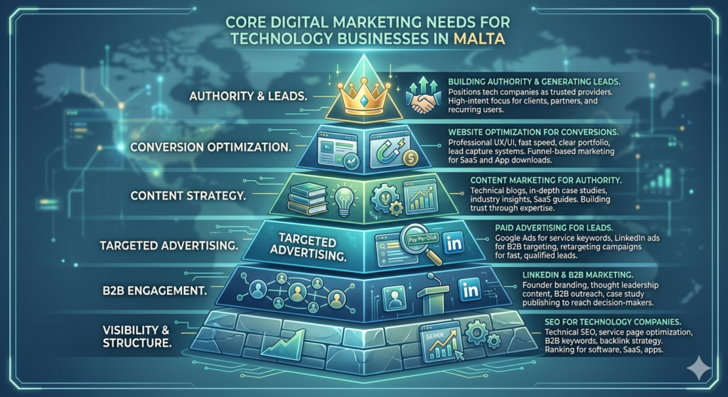 A strong tech marketing system in Malta focuses on visibility, authority, and lead generation.
